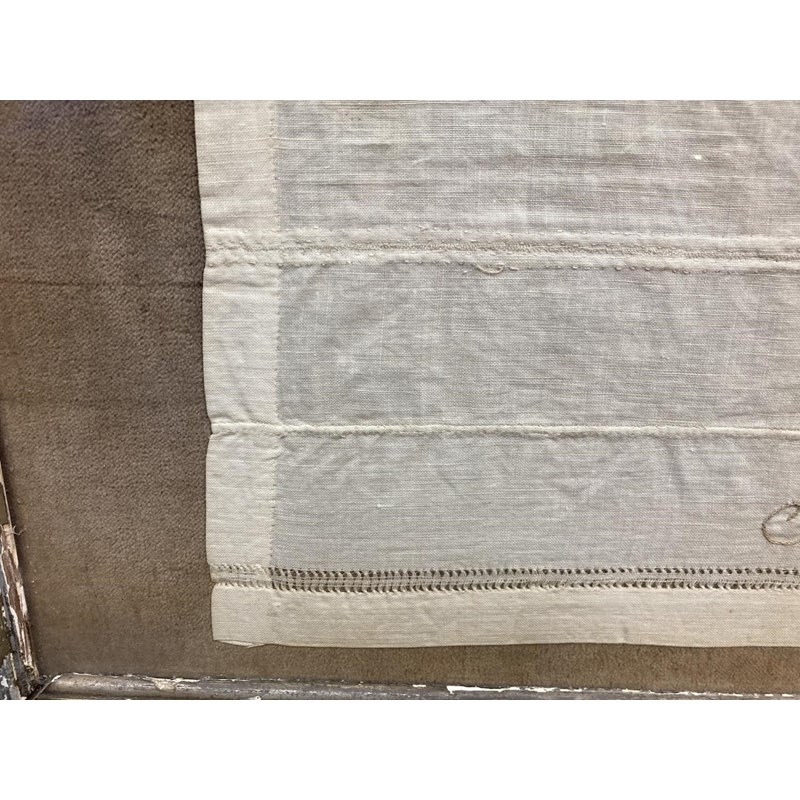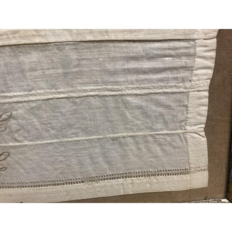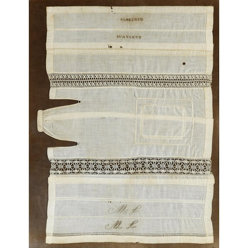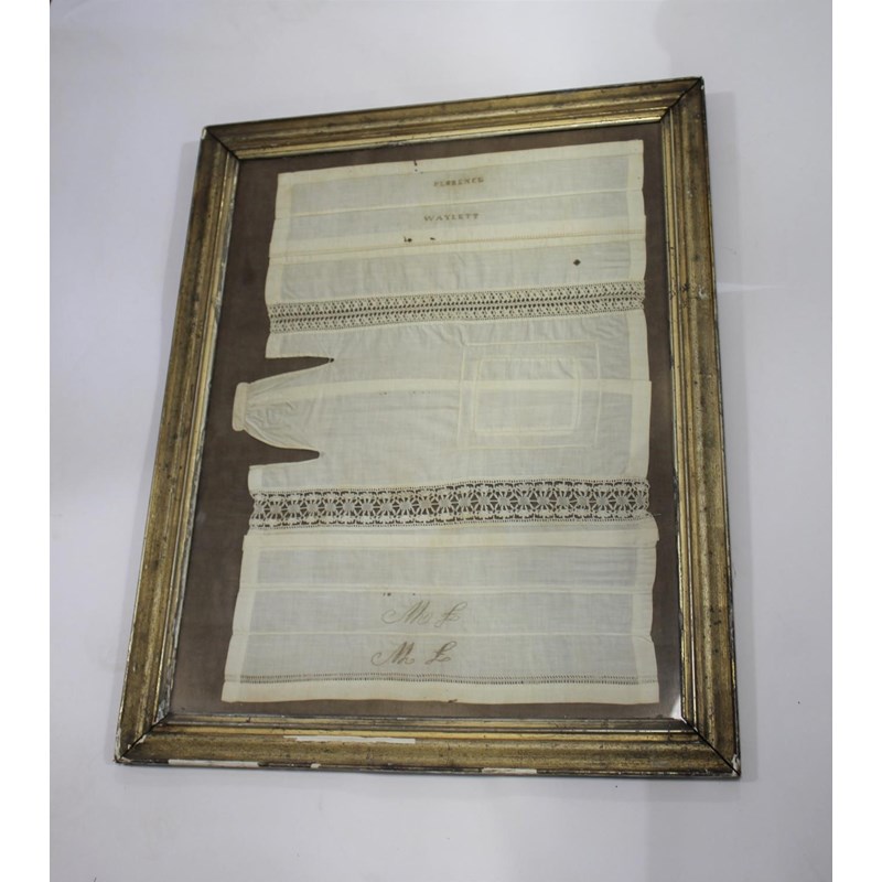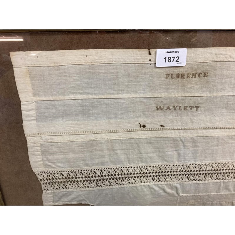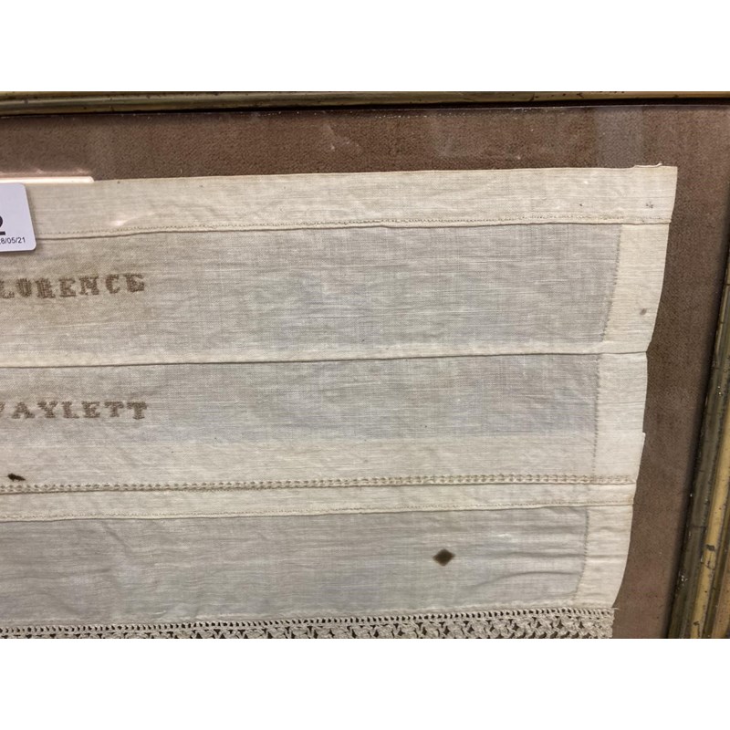 an unusual 19thc cotton needlework sampler, embroidered with the name Florence Waylett and two sets of initials. Framed and glazed and with some writing on the back, frame 74cms by 59cms