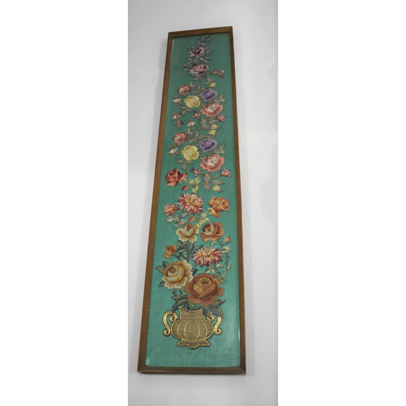 an early to mid 20thc Chinese embroidery of colourful roses in a vase, on a green silk ground and mounted in a frame. 142cms by 30cms