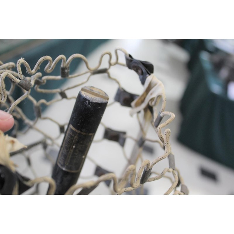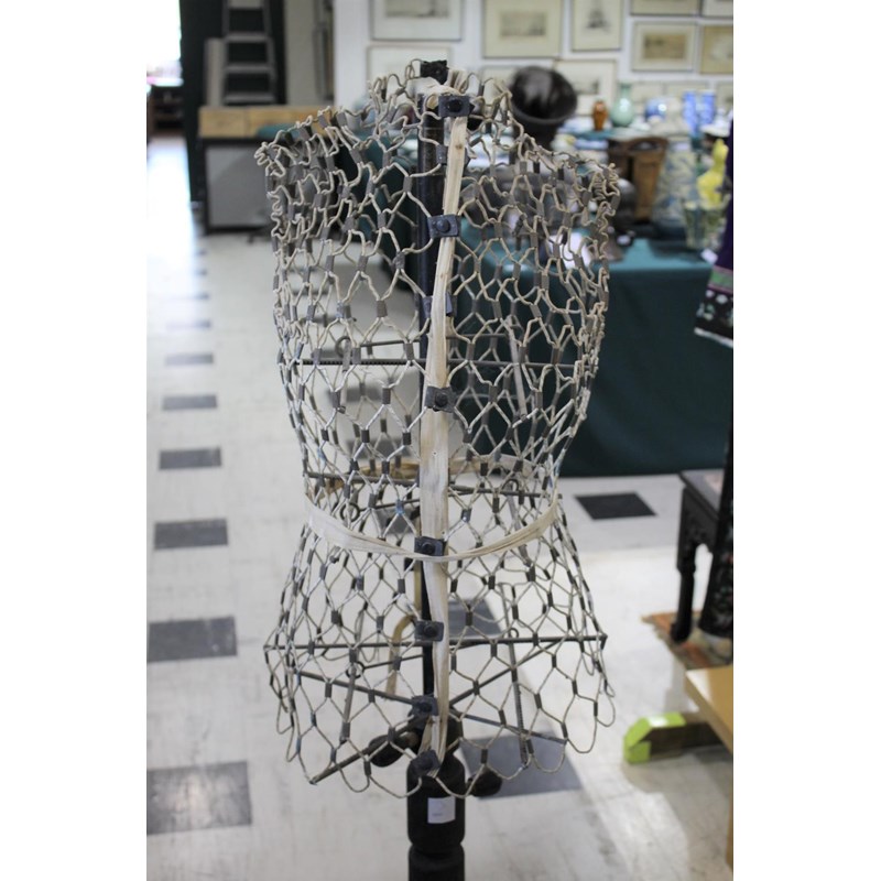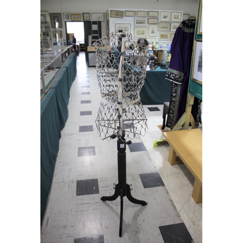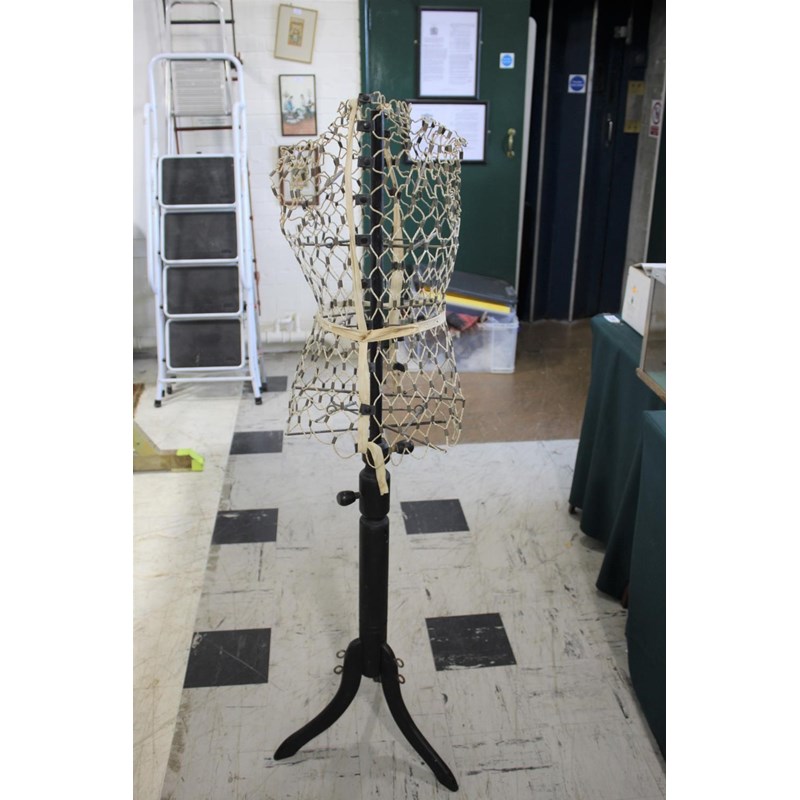a vintage mannequin with a wire work structure, supported on a wooden tripod base with wooden pegs for adjusting the height. With a label F S Sanders, My Double, London. 147cms high