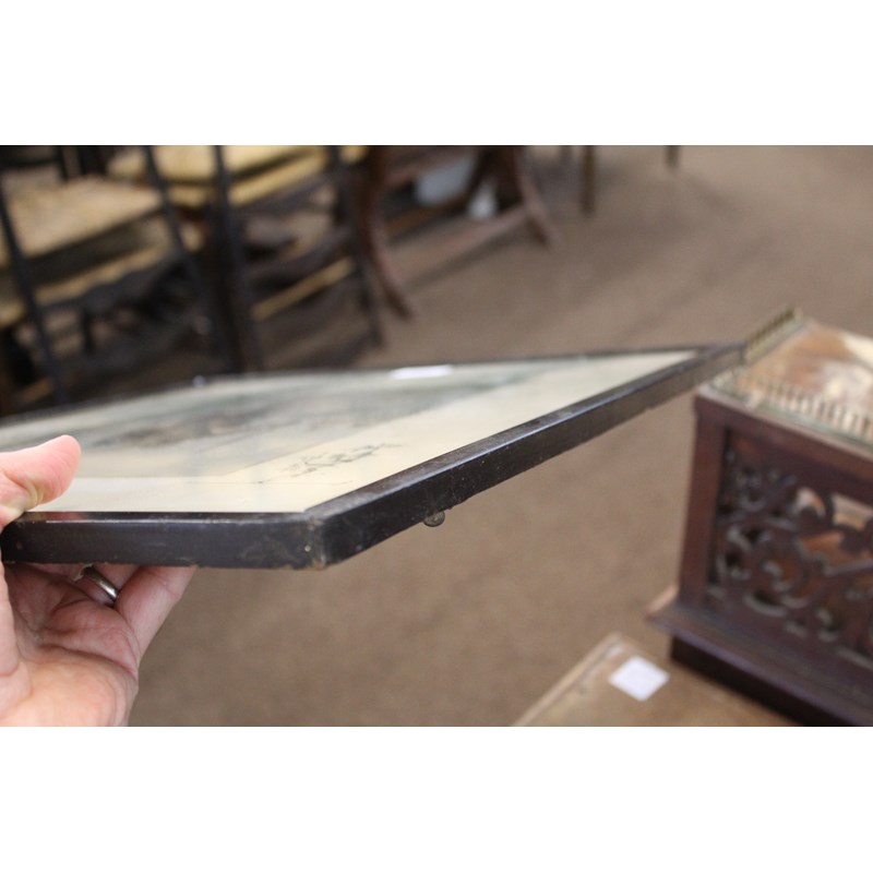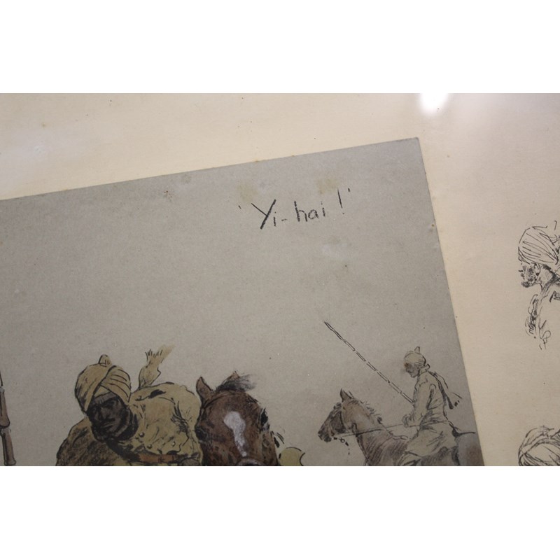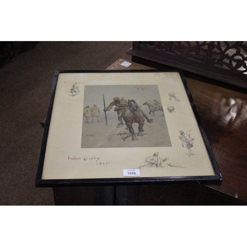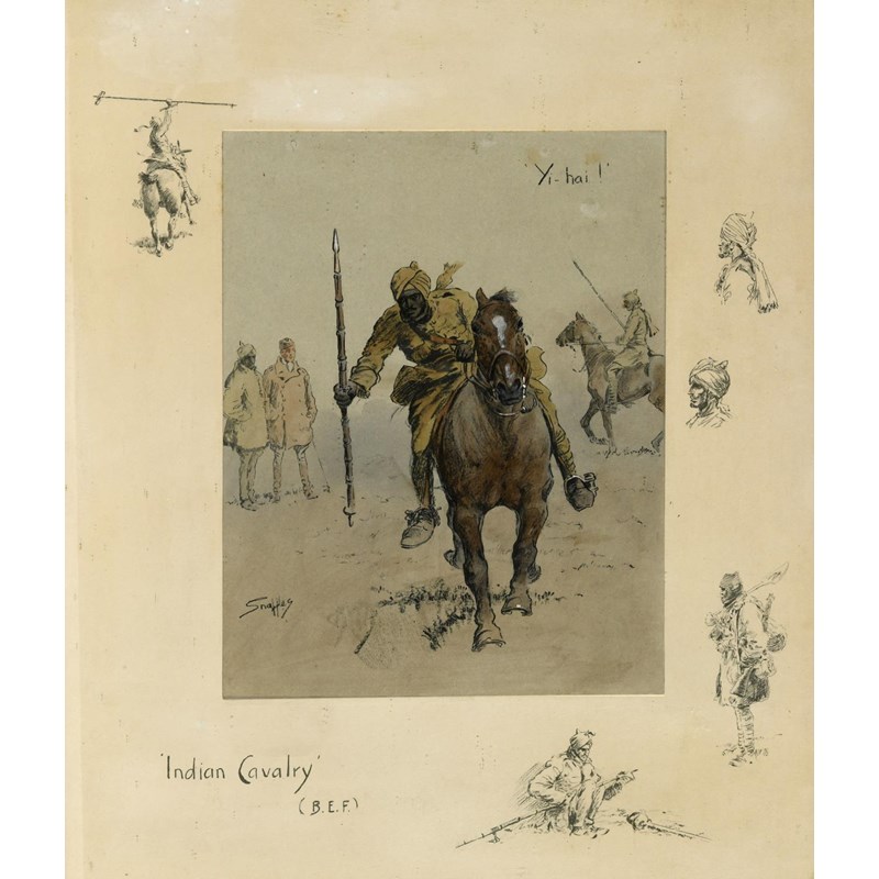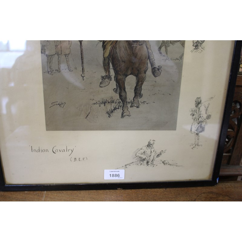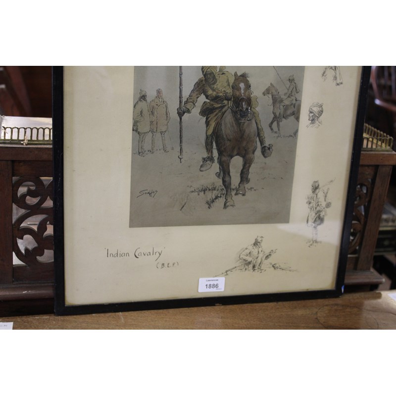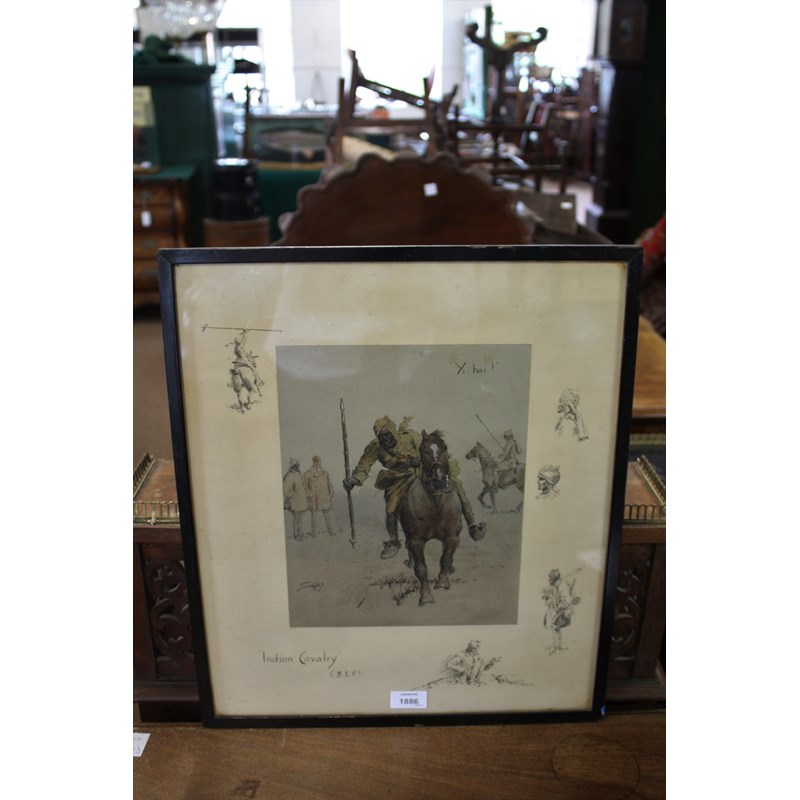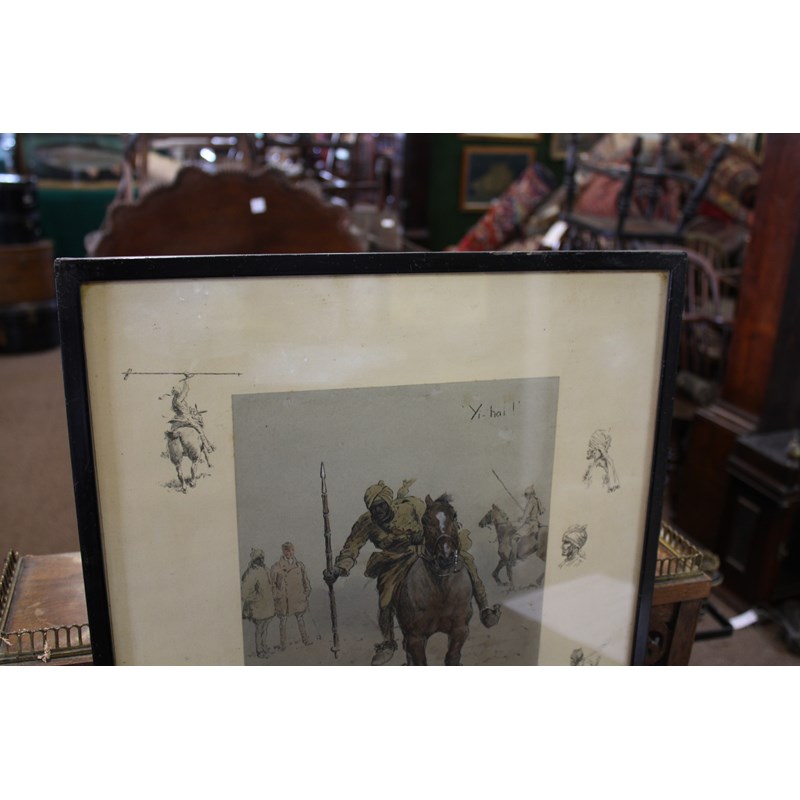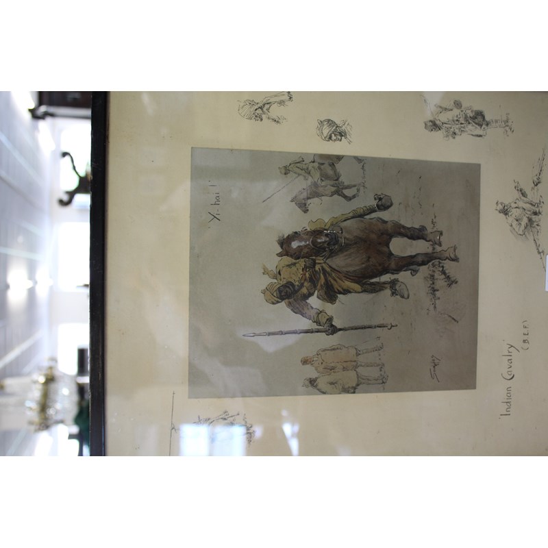 a colour print with black and white vignettes and blind stamp, titled Yi-hai, Indian Cavalry (B.E.F). Not signed, mounted in a frame. Frame 50cms by 43cms