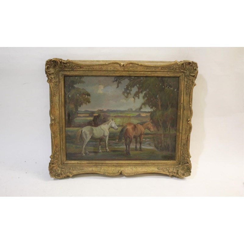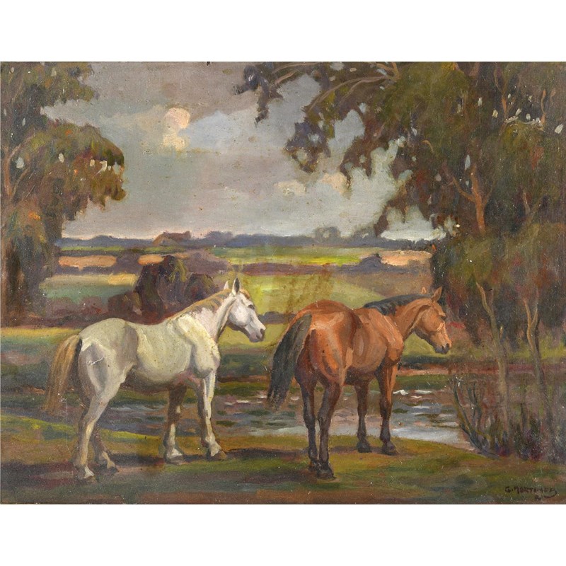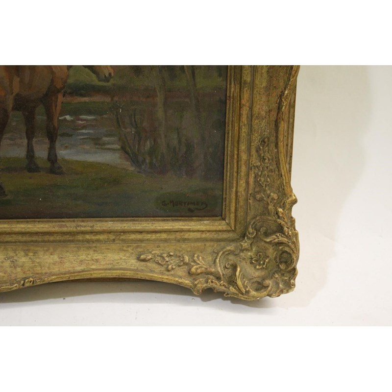 an oil on board of two horses by a country stream, and set within a landscape scene. Signed in the bottom right corner, G Mortimer, and mounted in a gilt frame. 38.5cms by 29.5cms, Frame 49cms by 40cms