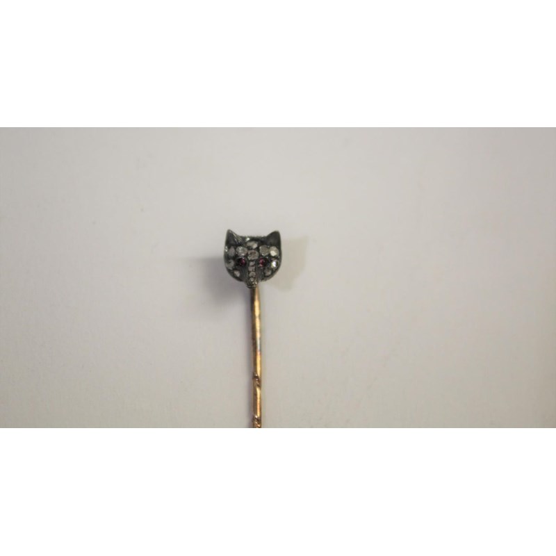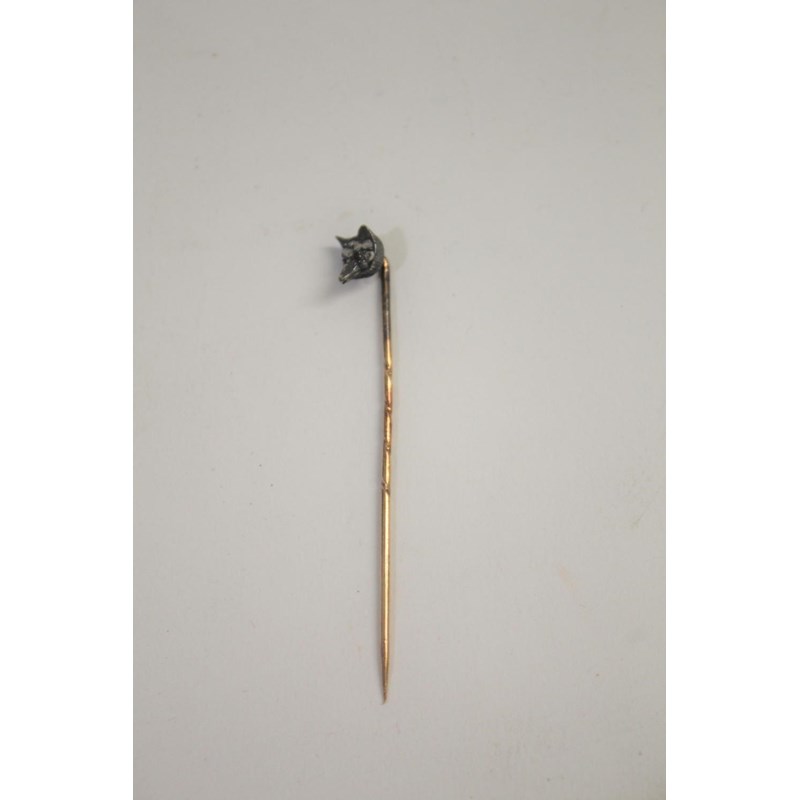 15CT GOLD STICK PIN - FOX a 15ct gold and rose diamond Fox head stick pin, stamped 15ct. 6cms long