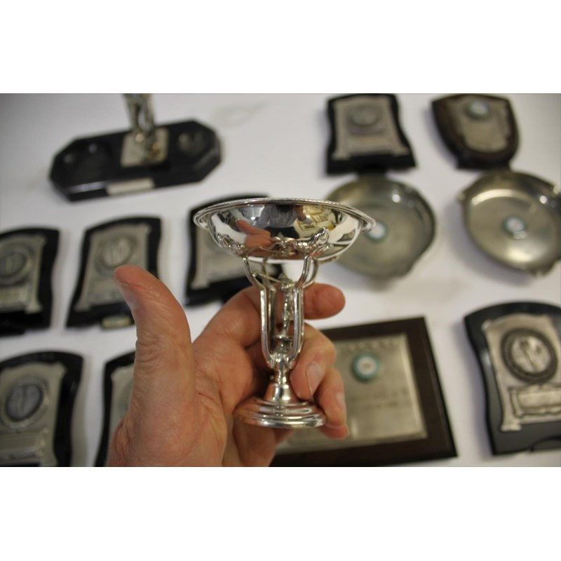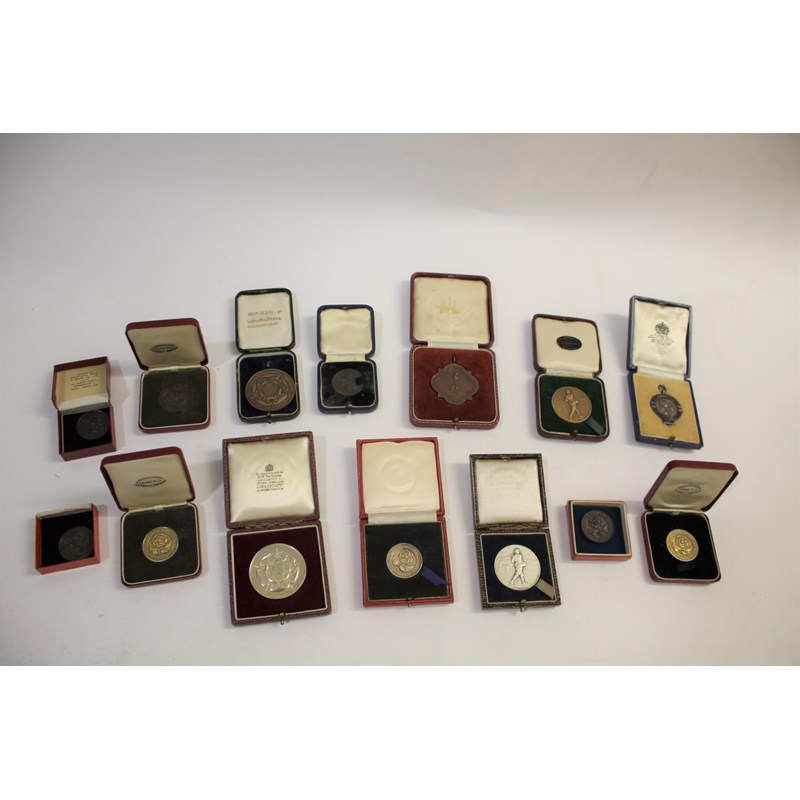 including various cased silver medallions including Aldeburgh Golf Club 1959, English Golf Union County Championship x3, English Golf Union Challenge Trophy, and Mixed Foursomes 1952 (not marked), all in fitted boxes. Also with various bronze medallions including Amateur Golf Championship (Walker & Hall), English Close Championship etc. Also with a small silver golfing trophy with lady golfer (9cms high), and various other trophies and ashtrays relating to W A Slark.