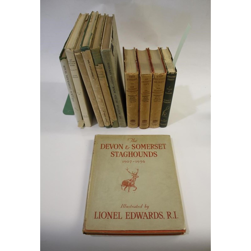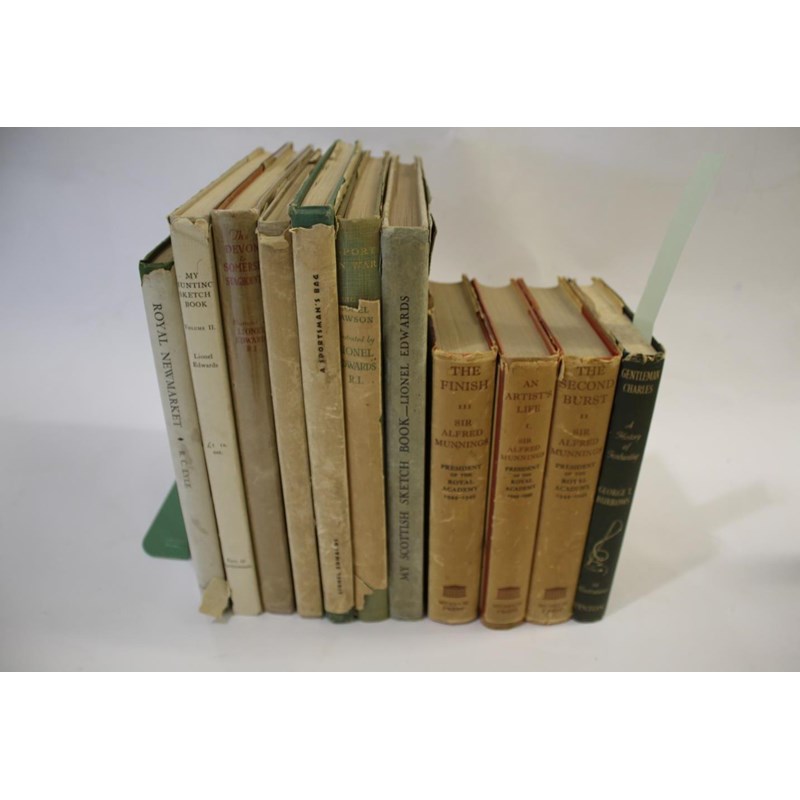 including My Scottish Sketch Book by Lionel Edwards (1929), Sport in War by Lionel Edwards (1936), A Sportsmans Bag by Lionel Edwards (1937), My Hunting Sketchbook by Lionel Edwards (1928), My Hunting Sketchbook Volume II by Lionel Edwards (1930) The Devon & Somerset Staghounds 1907-1936 by Lionel Edwards (1936), Gentleman Charles by George Burrows (1951), Royal Newmarket by R C Lyle (1945), and 3 volumes of The Autobiography of Sir Alfred Munnings (1950, 1951 and 1952). (11)