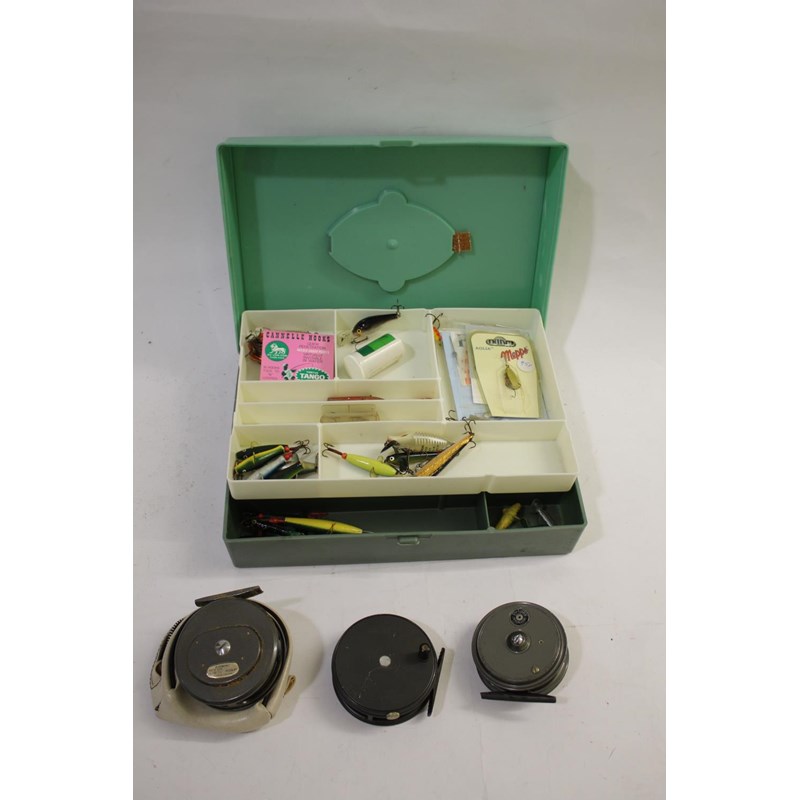 a Hardy Perfect 3 5/8 reel, with ebony winder and rim tension adjuster. Also with a J W Young & Sons Pridex reel, an Intrepid Rimfly reel, and a fishing box with various accessories including Devon Minnows, scales, penknife etc.