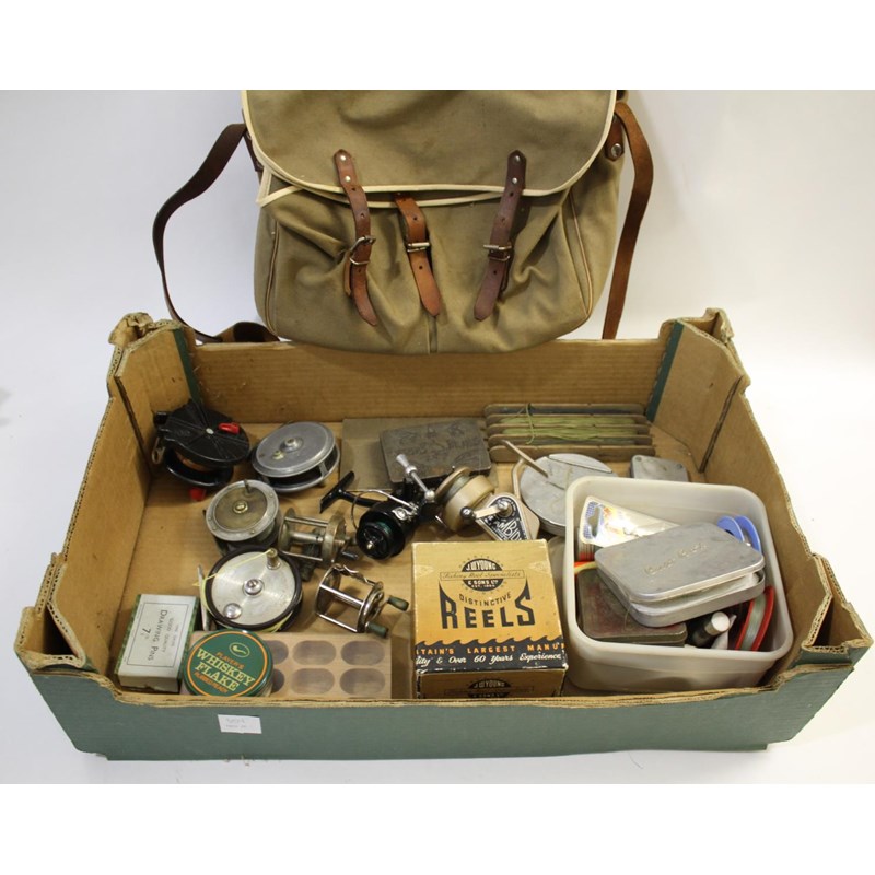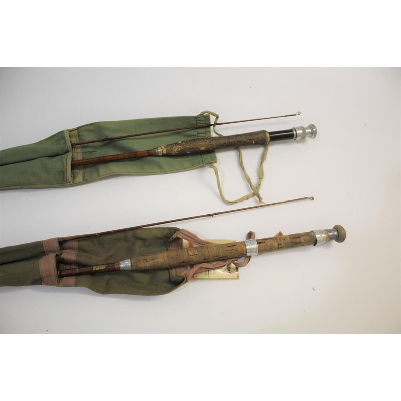 a mixed lot including a two piece Hardy Featherweight cane rod in Hardy bag, (9ft 2'), and a two piece cane rod retailed by W Tyler & Son, Falmouth (9ft 2',in a bag), also with a bakelite Ideal 6050 reel, alloy reel with brass foot, Shakespeare Leader, The Ambidex No 2 (with box), Mitchell 308, etc. Also with a fishing bag, fly tins, and various accessories.