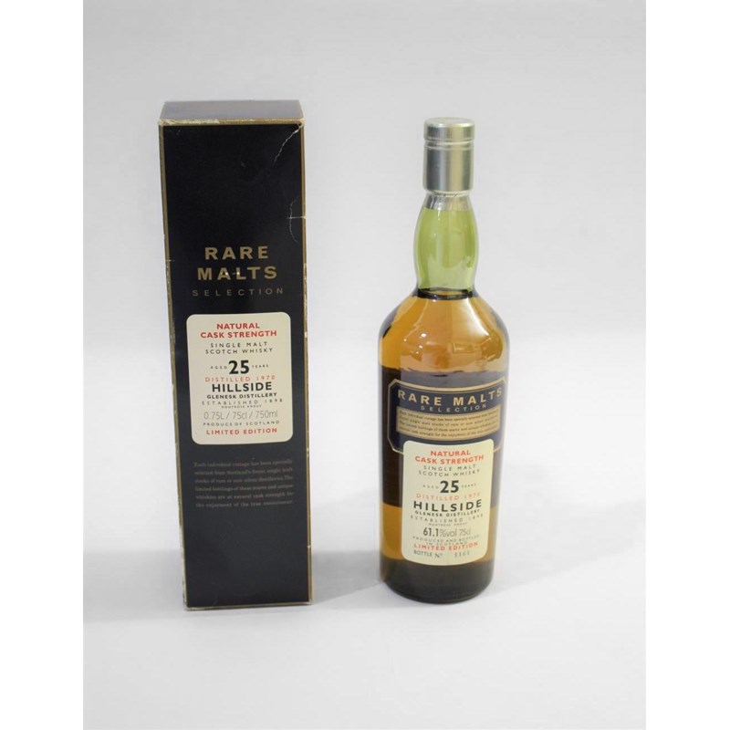 a boxed Hillside Aged 25 Years Single Malt Whisky, Glenesk Distillery, Limited Edition No 1161. Unopened and with its original box.
