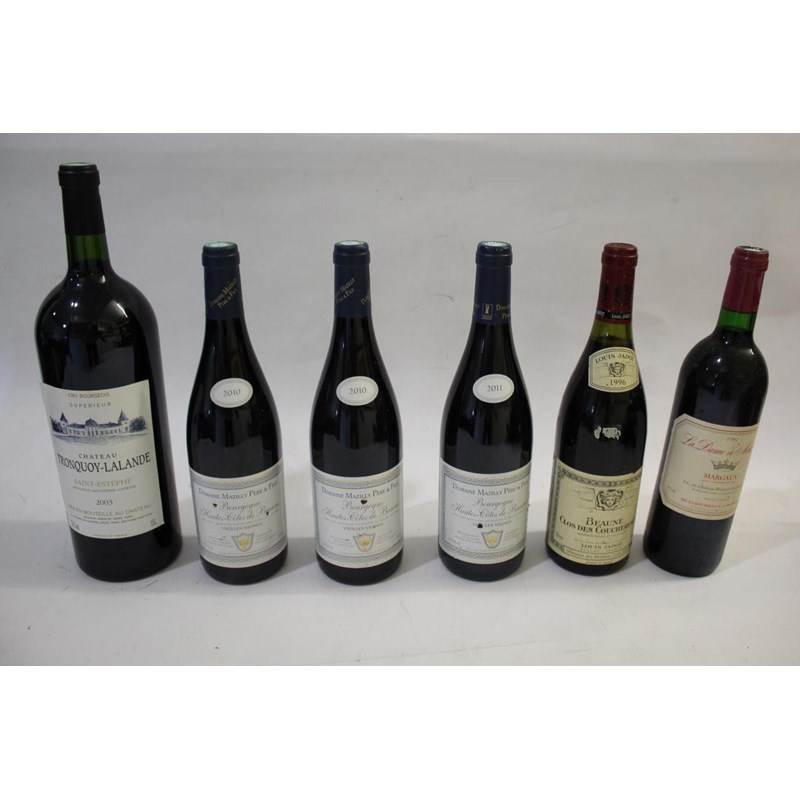 12 various bottles including a Magnum of Chateau Tronquoy Lalande Saint Estephe 2003 (1.5l), Domaine Mazilly Bourgogne (3 bottles, 2- 2010 and 1- 2011), La Dame de Malescot 1992, Beaune Clos des Couchereaux 1996, and 6 other various bottles. (12)