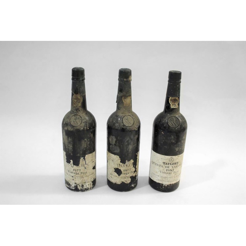 TAYLORS VINTAGE PORT including Taylors Quinta De Vargellas 1982, and 2 bottles of Taylors 1977 Vintage Port (both with torn labels). (3)