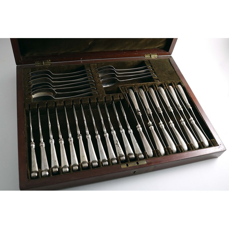 Twelve Victorian dessert knives and twelve Victorian two-prong dessert forks to match, by Francis Higgins, London 1885, all with George II/III pistol handles, and eleven early George II Hanoverian pattern dessert spoons, with plain rattails, mixed makers & dates, all of the above contained in a fitted canteen box; the box measuring 16.9" (43 cms) long; 10.2 oz weighable silver (35)