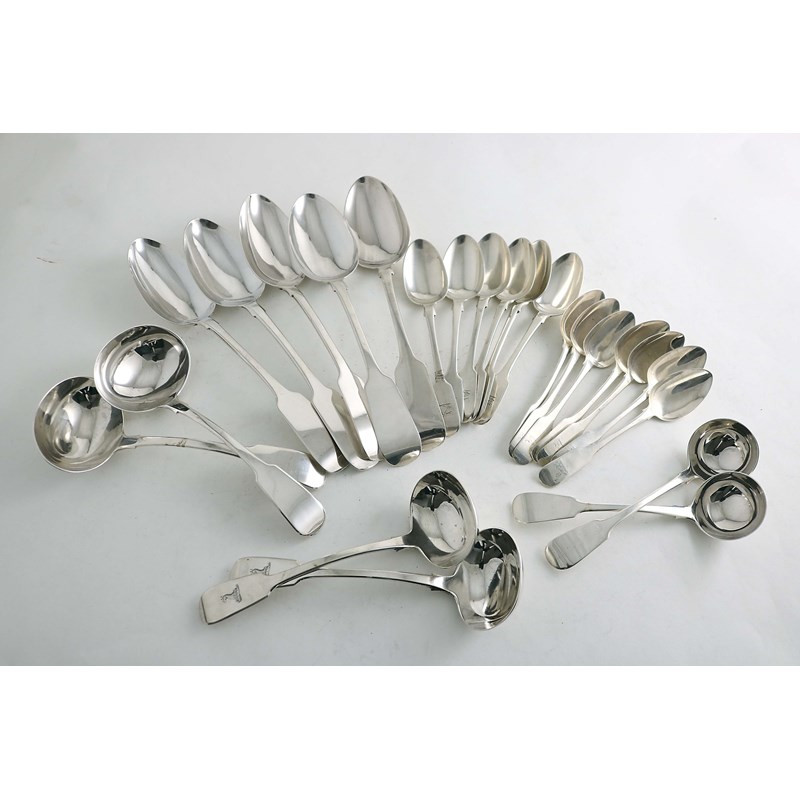 A set of five George IV table spoons, a set of seven George III tea spoons, crested, a set of six George III tea spoons, crested, a pair of George IV sauce ladles, a pair of William IV toddy ladles, and a pair of Victorian sauce ladles, crested & initialled, mixed makers & dates; 30.8 oz (24)