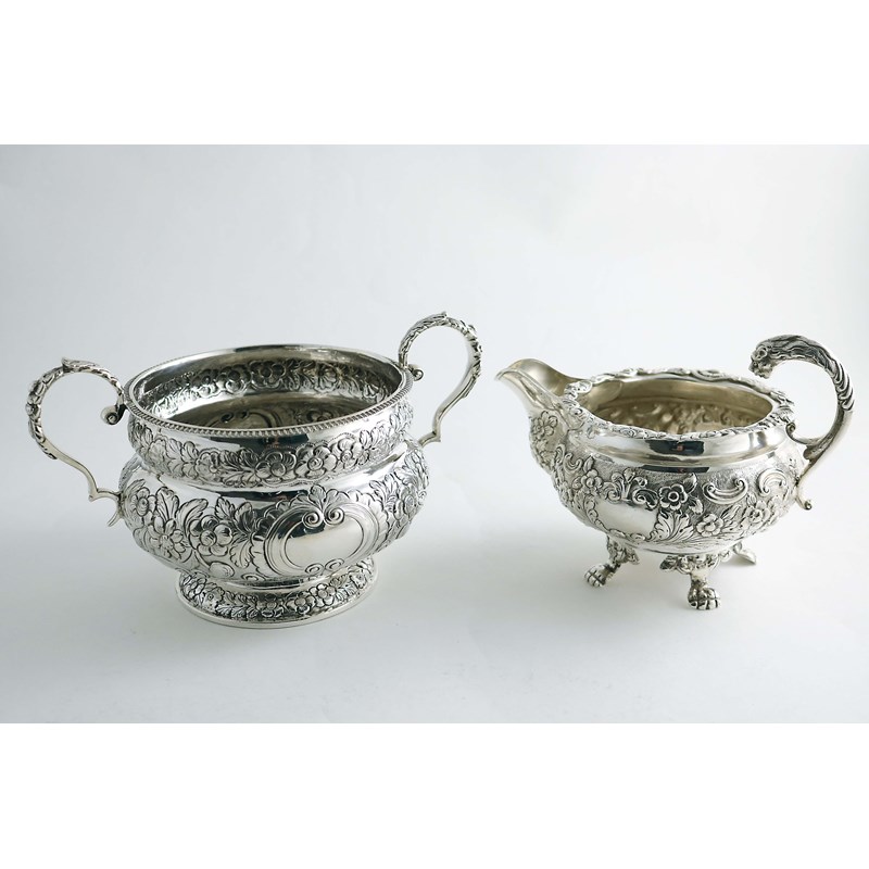 circular with decorative scroll handles and two vacant cartouches, by Edward Power, (retailer's mark of Twycross), Dublin 1825 and a George IV Irish embossed cream jug with a lion mask handle and paw feet, by either Richard Sherwin or Richard Sawyer, Dublin 1826; the latter 5" (12.5 cms) high; 22.9 oz (2)