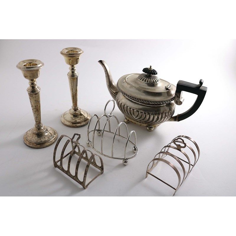 A pair of small, late 20th century candlesticks, loaded, a small Edwardian tea pot, A/F, and three small toast racks; the candlesticks 6.25" (15.8 cms) high; 17.85 oz weighable silver (6)