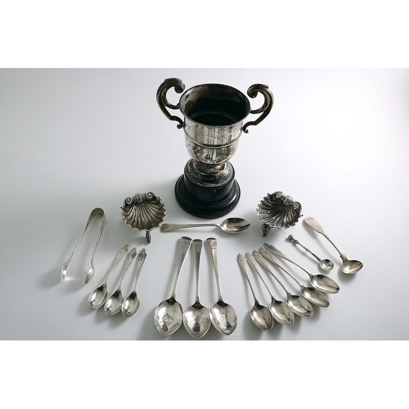 A small Irish trophy cup, inscribed, by West & Sons, Dublin 1943 (wooden plinth), a pair of small Victorian shell salts, fourteen various small spoons & a pair of sugar tongs; the cup 5.25" (13.3 cms) high; 12.4 oz (18)