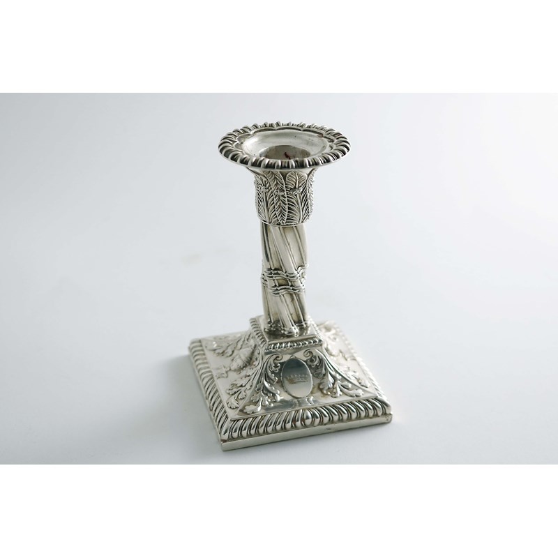 in the neo-classical taste with a wrythen cluster column, a stiff leaf capital and gadrooned borders, the base with foliage and urns in relief, engraved on one side with a Viscount's coronet, by J. Aldwinckle & T. Slater, London 1886 (loaded); 5" (13 cms) high