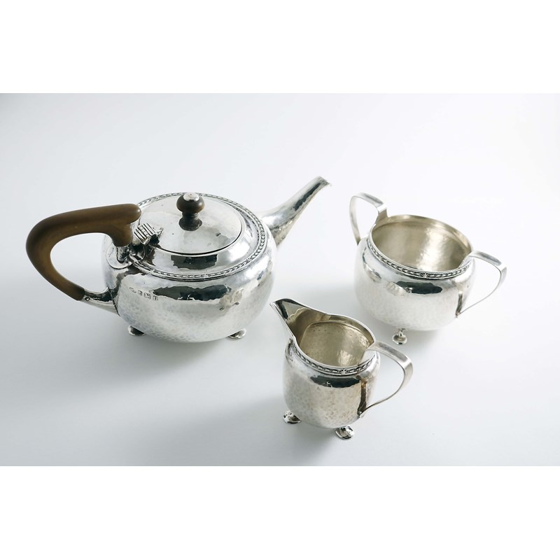 AN EARLY 20TH CENTURY ARTS & CRAFTS THREE-PIECE TEA SET