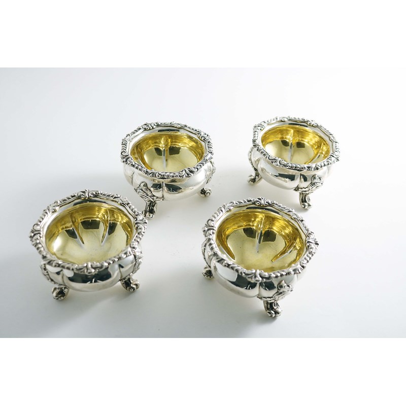 of shaped circular outline on three foliate scroll feet, with gadroon & foliate borders and gilt interiors, initialled underneath "SSE to MEE", by John S. Hunt, London 1845; 3.75" (9.5 cms) diameter; 26.4 oz (4)