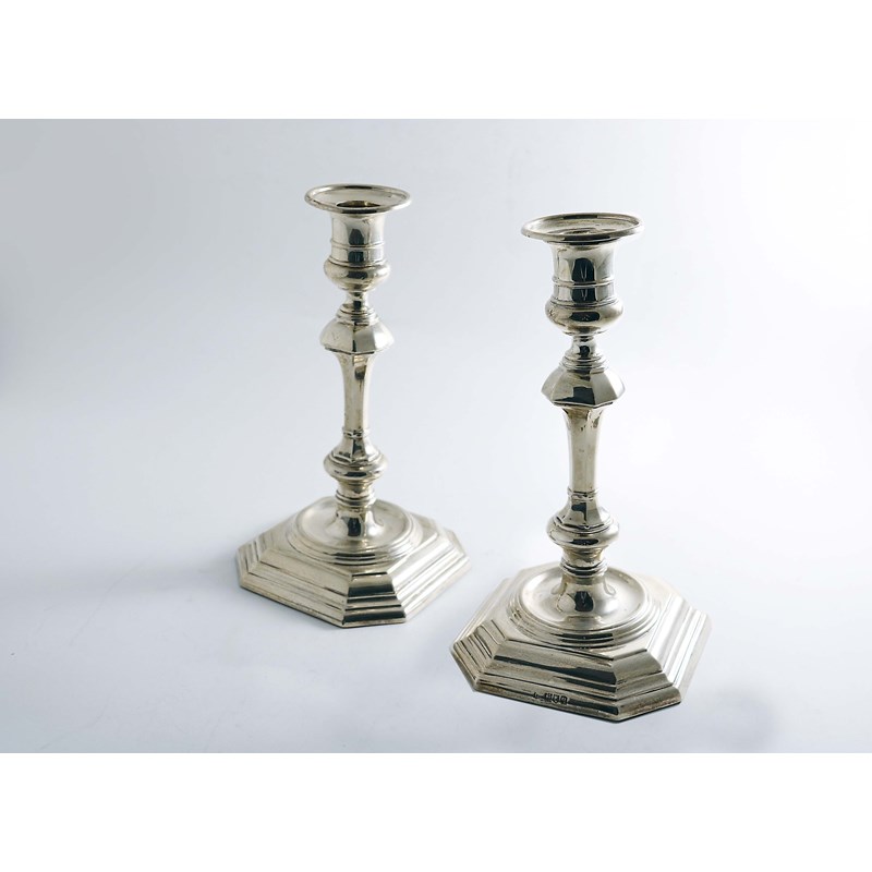 A PAIR OF EARLY 20TH CENTURY CANDLESTICKS on canted square bases with "well" centres, knopped columns & detachable nozzles by T. Bradbury & Sons, London 1911 (loaded); 9.2" (23 cms) high (2)