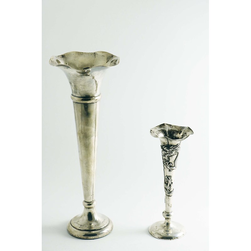 decorated with an applied dragon, by Wang Hing & Co., 1900-1920 and a larger single vase, with a small dedication inscribed on the base, maker's mark worn, Birmingham 1910; the latter 12.25" (31 cms) high (2)