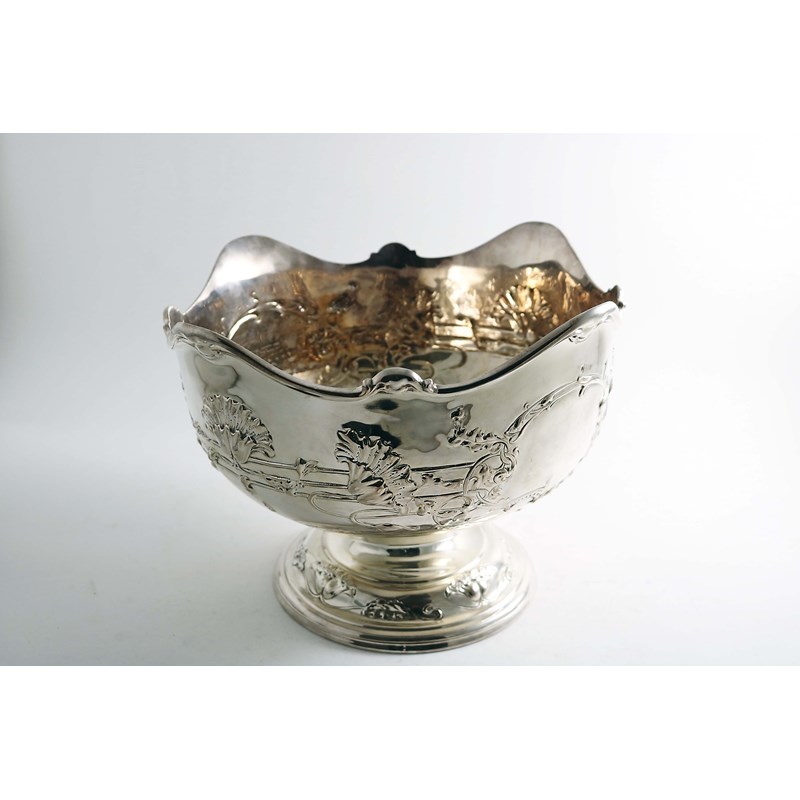with a wavy scroll rim and repousse Art Nouveau floral decoration around the sides and two vacant cartouches, by Harrison Bros. & Howson, Sheffield 1902; 11.75" (30 cms) diameter; 41 oz