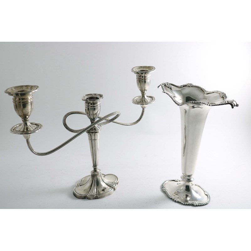 with shaped, gadroon and scroll borders, maker's mark "JD" (script), Birmingham 1913 and a late 20th century 3-light candelabrum, lacking one detachable nozzle (loaded base); the vase 9" (23 cms) high; 8.2 oz weighable silver (2)