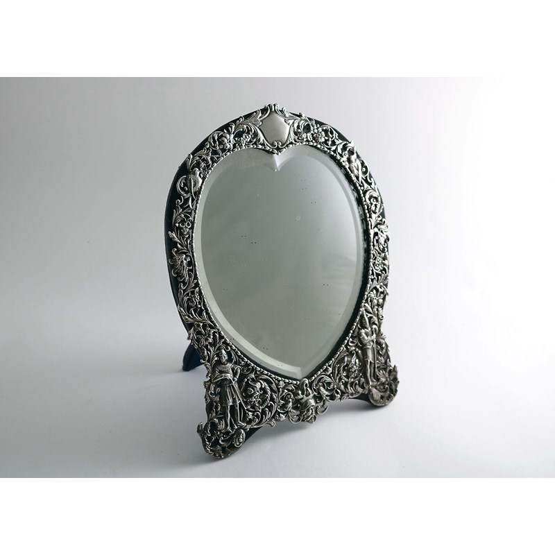 with bevelled glass & an easel stand, the border pierced and embossed with figures, birds, flowers and scrolls, with a vacant cartouche at the top, by William Comyns, London 1890;  12"  (30.5 cms) high