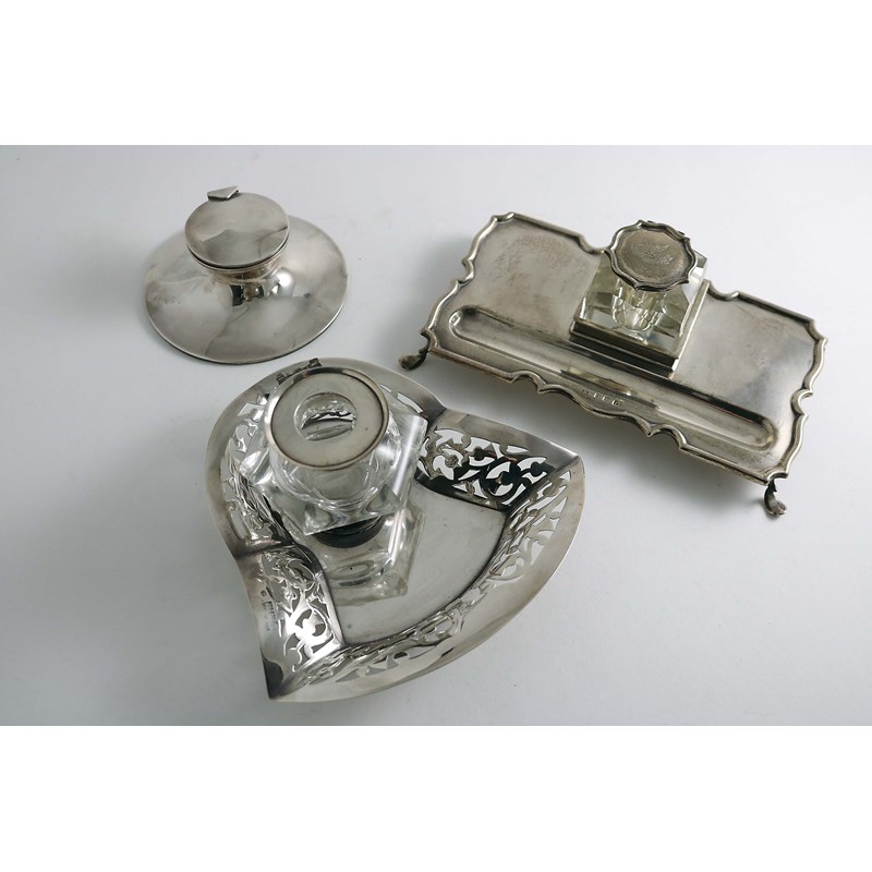 of shaped rectangular outline with a central, mounted, faceted glass ink bottle, crested, by Barker Brothers, Birmingham 1905, together with a small capstan inkwell, another inkstand, (A/F);  the rectangular example 7.3"  (18.5 cms) long;  13.3 oz weighable silver  (3)