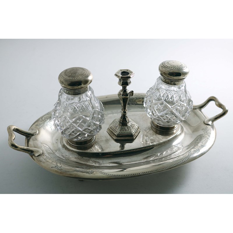 with twin handles and engraved decoration, fitted with two mounted cut-glass bottles and a central taperstick, by Henry Wilkinson & Co.Ltd., Sheffield 1868 (A/F);  11.9"  (30 cms) long;  15.3 oz weighable silver