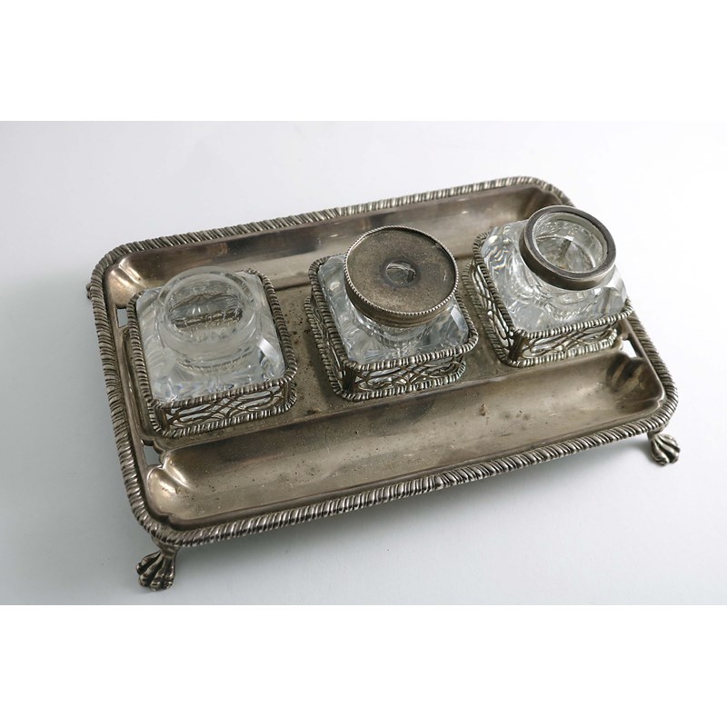 rectangular, on paw feet, with rounded corners, gadrooned borders and three pierced receivers, by William Robertson, London 1762 with three associated cut-glass ink bottles (two with mounts) and one cover; 10.5" (26.8 cms) long; 20.2 oz