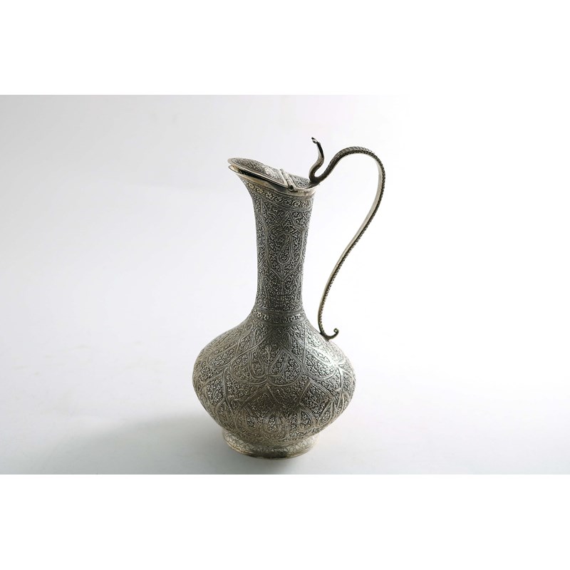 of baluster form with a tall neck, a serpent handle and profusely chased decoration, unmarked, Kashmir, c.1900; 8.3" (21.2 cms) high; 14.3 oz