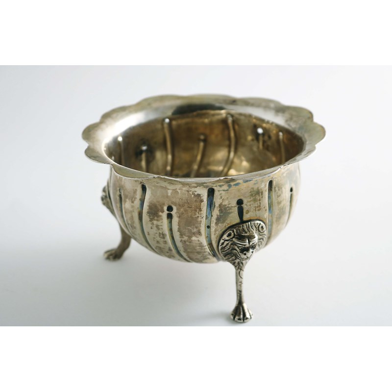 on three lion mask and paw feet with a lobed circular rim and wrythen fluting, by Samuel Walker, Dublin c.1750 (no date letter); 5.1" (13 cms) diameter; 6 oz