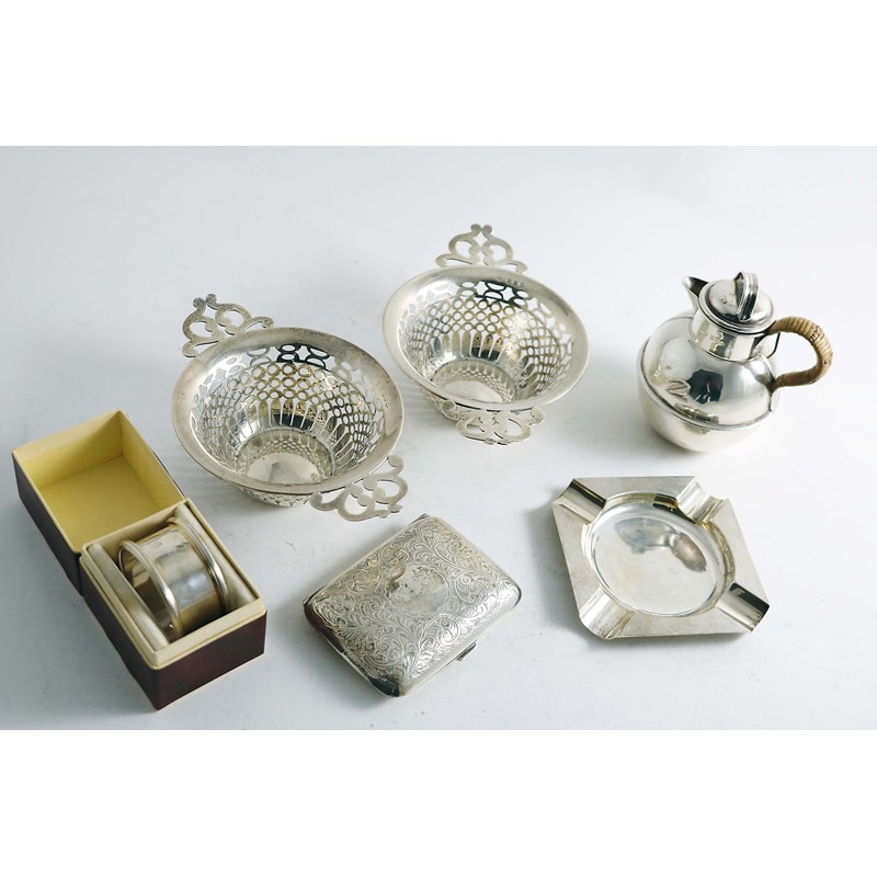 A pair of bonbon dishes, an ash tray, a cigarette case, a napkin ring and a small Edwardian "Jersey" can, maker's mark "WG&S", Birmingham 1906; the latter 4" (10 cms) high; 10.6 oz weighable silver (6)