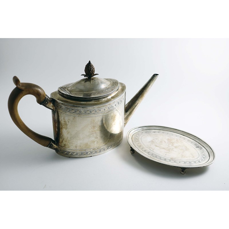 with a pineapple finial, and a matching oval stand, decorated with pricked borders of wrigglework and wave-like scrolls, scratched underneath with the initials "EH", by Soloman Hougham, London 1799; the tea pot 7" (18 cms) high; 19.5 oz (2)