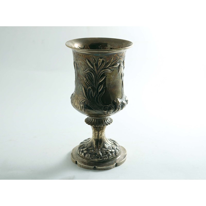 A mid 20th century embossed trophy goblet, inscribed on one side "HENLEY ROYAL REGATTA 1939 CENTENARY" and on the other "THE SILVER GOBLETS", by the Goldsmiths & Silversmiths Co.Ltd., London 1939; 7.9" (20 cms) high; 13.45 oz