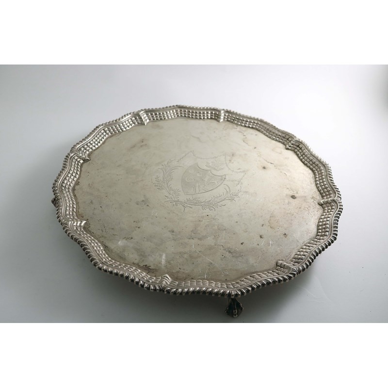 of shaped circular outline with a textured border, gadrooned rim and ball & claw feet, the centre engraved with a coat of arms, by either Robert Rew or Richard Rugg, London 1764; 15" (38 cms) diameter; 53.2 oz