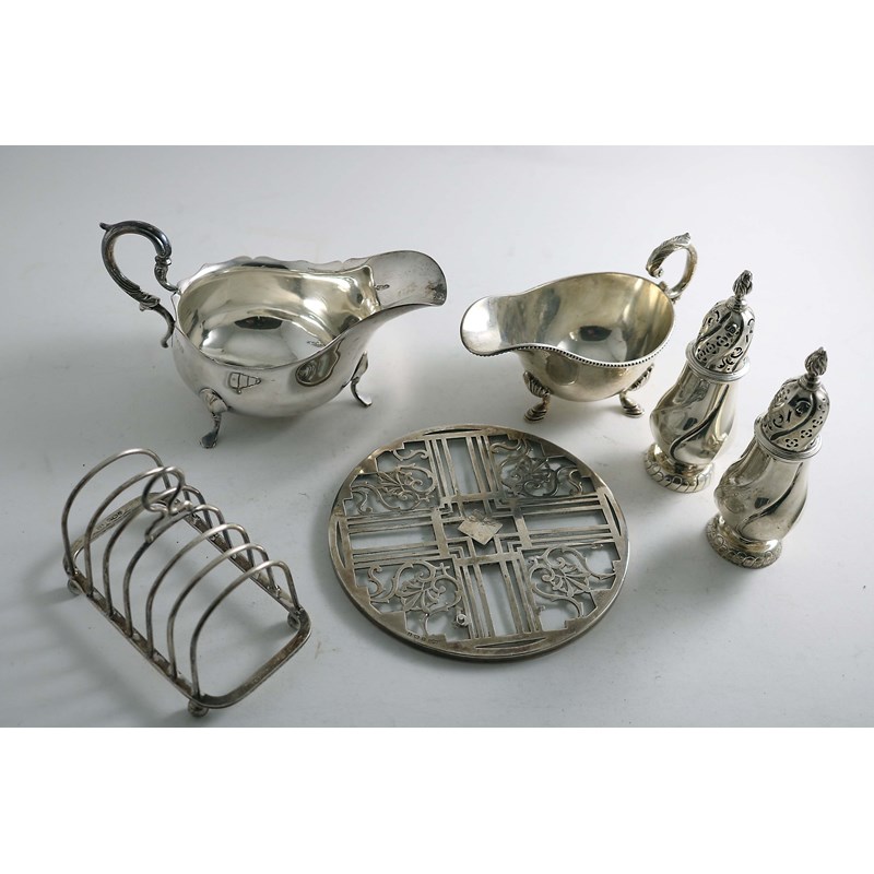 An Edwardian sauce boat with a beaded rim, by Walker & Hall, Sheffield 1909, another slightly larger sauce boat, a mounted glass tea pot stand, a toast rack, and a pair of Victorian, wrythen-fluted pepper casters, by J.S. Beresford, London 1885; the casters 5.2" (13 cms) high; 22.8 oz weighable silver