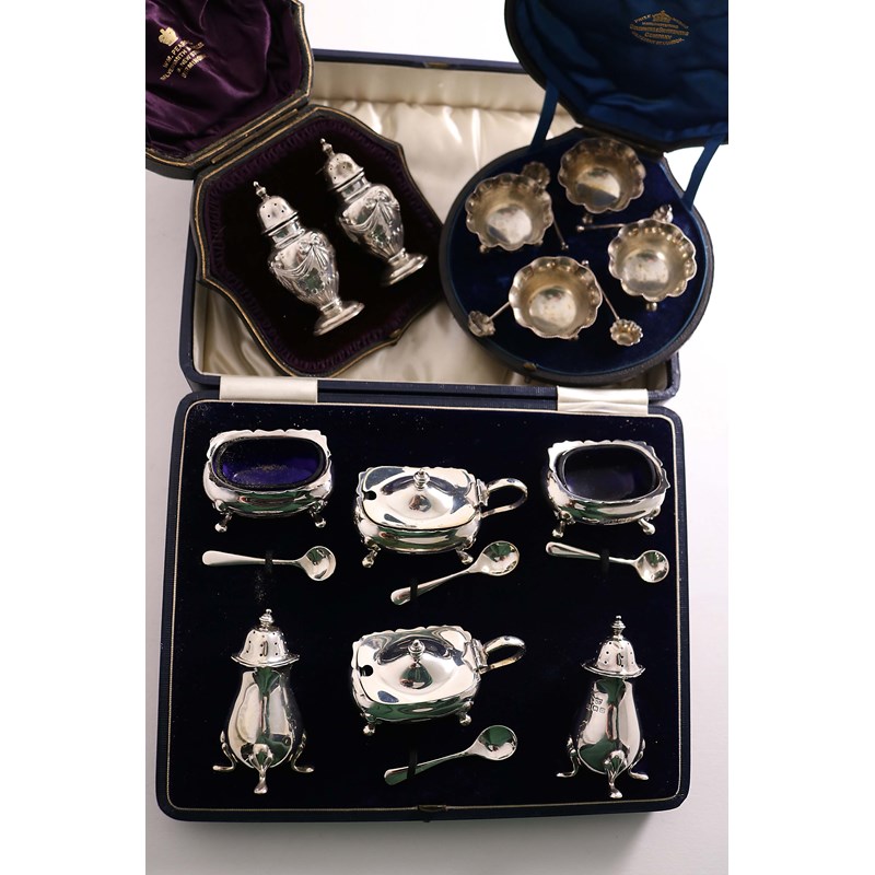 by R. Martin & E. Hall, Sheffield 1901, a cased set of four small Victorian salts & matching spoons by W. Gibson & J. Langman, Birmingham 1890 and a cased six-piece condiment set (blue glass liners), by Mappin & Webb, Birmingham 1928, with four small spoons; the pepperettes 3" (7.4 cms) high; 9 oz weighable silver (3)