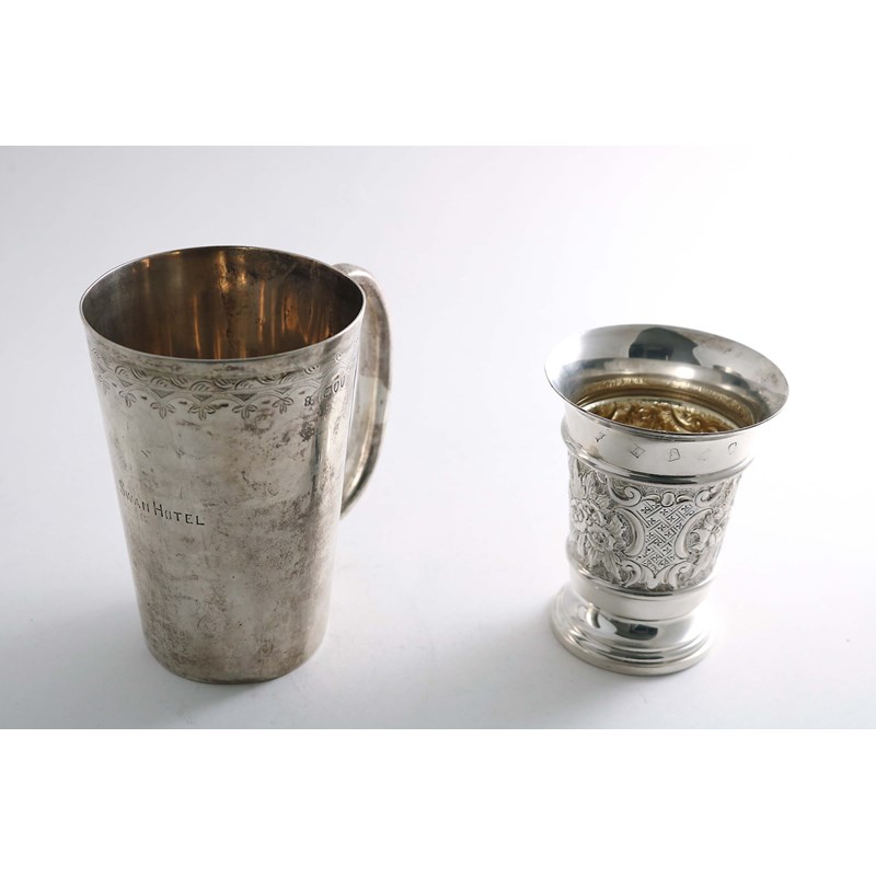with an engraved frieze below the rim, inscribed "SWAN HOTEL" on the front, by W & G. Neale, London 1894 and a late 20th century beaker with a chased frieze around the middle & a flared rim, by S.J. Rose & Son, Birmingham 1977; the latter 4" (10 cms) high; 11.4 oz (2)