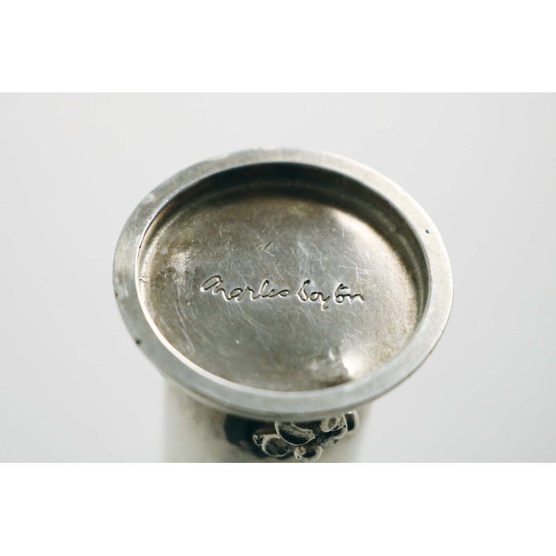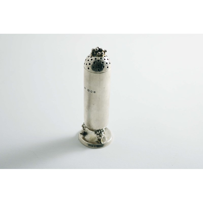 of cylindrical form with fruiting legs, a circular base and a domed cover with fruit finial, by Charles Boyton, London 1939, also signed on the base with Boyton's facsimile signature; 4.1" (10.5 cms) high; 2.4 oz