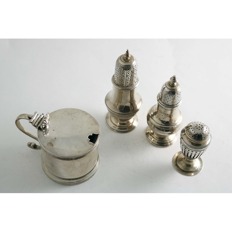 An Edwardian plain drum mustard pot (blue glass liner), by Stokes & Ireland Ltd., Chester 1908 (retailed by Depree & Young Ltd. of Exeter) and three various casters (one with a blue glass liner); the mustard 2.75" (7 cms) high; 10.6 oz weighable silver (4)