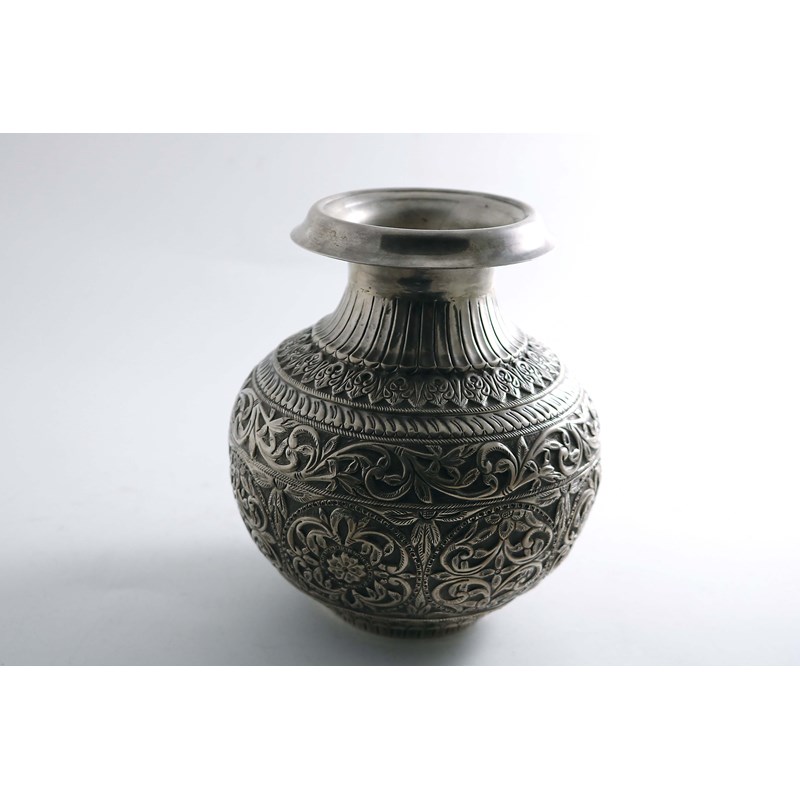 A 20TH CENTURY INDIAN WATER VESSEL with embossed decoration, a waisted neck and a plain, rolled over rim, unmarked; 8.1" (20.5 cms) high; 23.4 oz