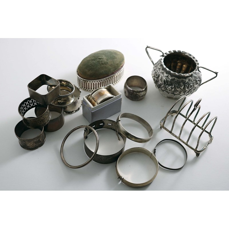 Eight various napkin rings, most with initials/dedications, a mounted fabric jewel box/pin cushion, a toast rack, an embossed sugar bowl, and five various bangles; the jewel box 4" (10 cms); 13 oz (16)