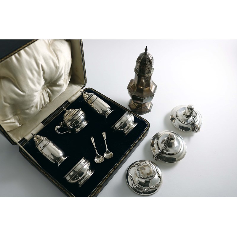 A pair of table lighters of squat circular form with snuffers, by Asprey & Co.Ltd., Birmingham 1922, a small capstan inkwell, glass liner (loaded base), an octagonal sugar caster and a cased five-piece condiment set with two spoons (blue glass liners); the lighters 3.1" (8 cms) diameter; 19.25 oz weighable silver (5)