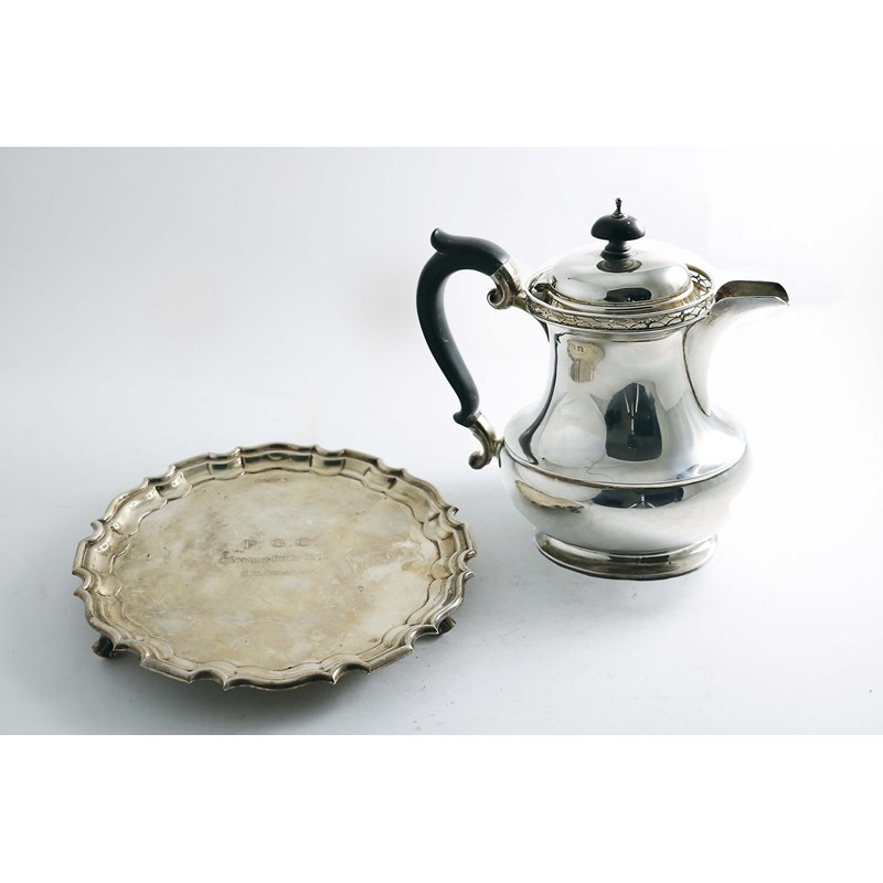with a waisted neck and a galleried rim, marks worn, Birmingham 1927 and a small salver, inscribed by Walker & Hall, Sheffield 1961; the latter 8.25" (21 cms) diameter; 30.4 oz (2)
