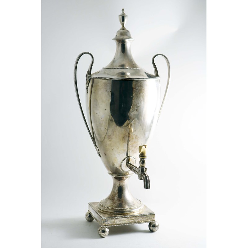 of slender vase form on a square pedestal base with ball feet, loop handles and bead borders, the domed and spool-shaped cover with an urn finial (lift-out Old Sheffield liner to take a hot iron), maker's mark "W.T", possibly by William Turnton, London 1781; 22" (56 cms) high; 84.25 oz weighable silver