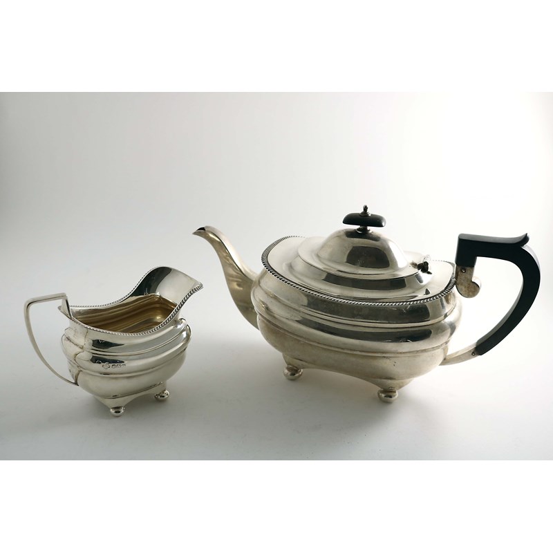 of barge form with button feet and gadrooned borders, by R.J. Allenborough & Co., Sheffield 1941; the tea pot 6" (15.5 cms) high; 34.5 oz (2)
