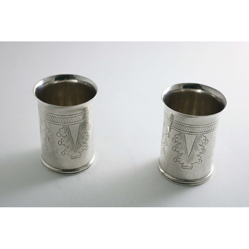 with flared rims and chased debased foliage around the sides, loosely resembling Charles II examples, maker's mark of J. Brothers, Sheffield 19778; 3.5" (9 cms) high; 11 oz (2)