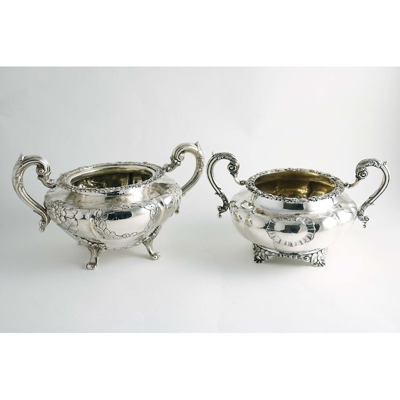 circular with chased decoration and four feet, by J & E. Moore, Dublin 1838 and another slightly smaller Irish sugar bowl with two chased, shell-like cartouches, by John Mahony, Dublin 1836; the latter 6.25" (16 cms) diameter; 33.55 oz (2)