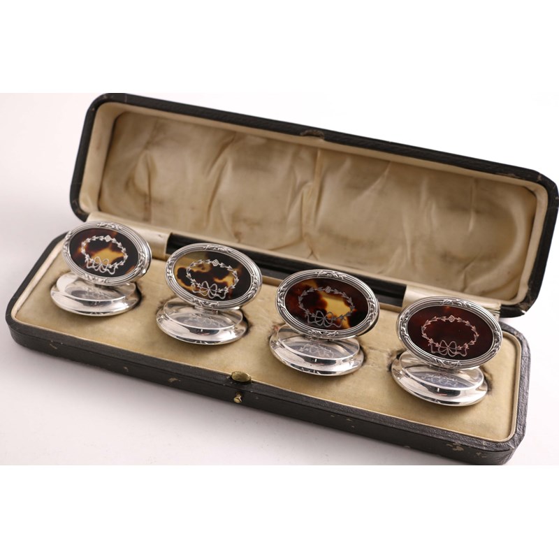 A CASED SET OF FOUR EARLY 20TH CENTURY MOUNTED TORTOISESHELL PLACECARD HOLDERS on circular bases, with inlaid decoration, by H. Matthews, Birmingham 1913/14; each one 1.75" (4.5 cms) long
