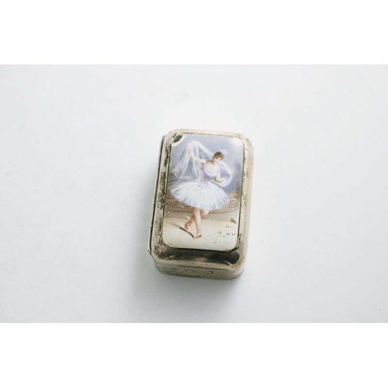 of plain, rounded oblong form, enamelled on the cover in polychrome with a ballerina dancing with a shawl, gilt interior, by George Heath, London 1887; 2" (5 cms) long; 1.2 oz
